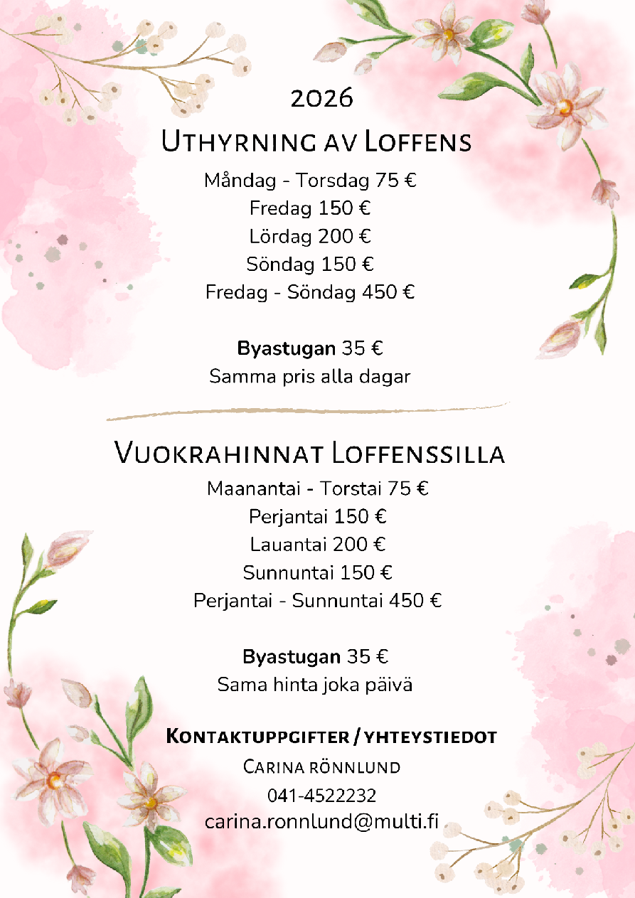 Loffens finns för dig som behöver en modern lokal för både vardag och fest. Vid Loffens som rymmer 80 personer ordnas bröllop, dop, födelsedagar, klassträffar, föreningsträffar, kurser, företagsmöten med mera. Loffens går att hyra året runt.